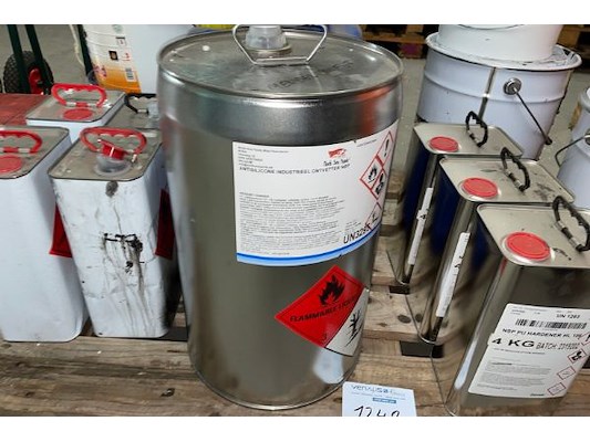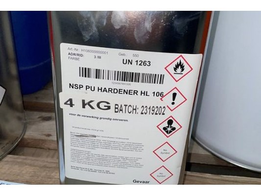 Lot diverse producten waaronder PU harder: 3x 4 kg, rest ontvetter, PU thinner, muurverf