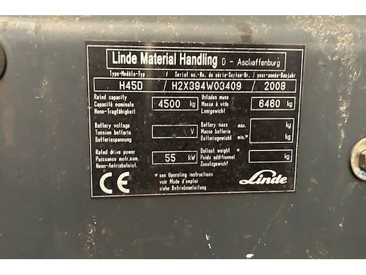 Heftruck Linde H45D, bj 2008, cap 4500 kg, 2 mast, doorrijhoogte 360 cm, max masthoogte ong 605 cm, vorklengte 120 cm, ge...