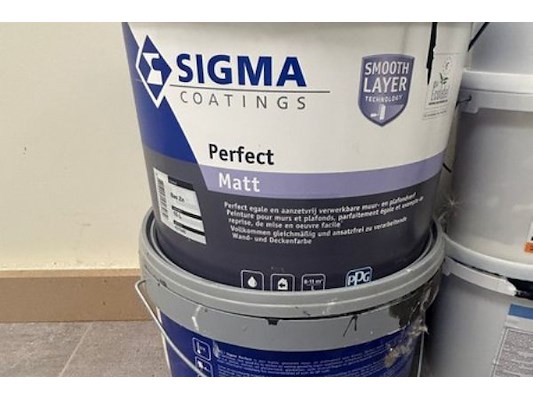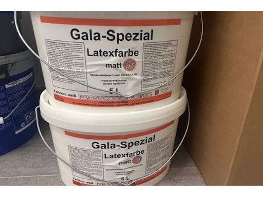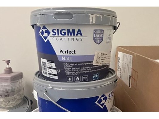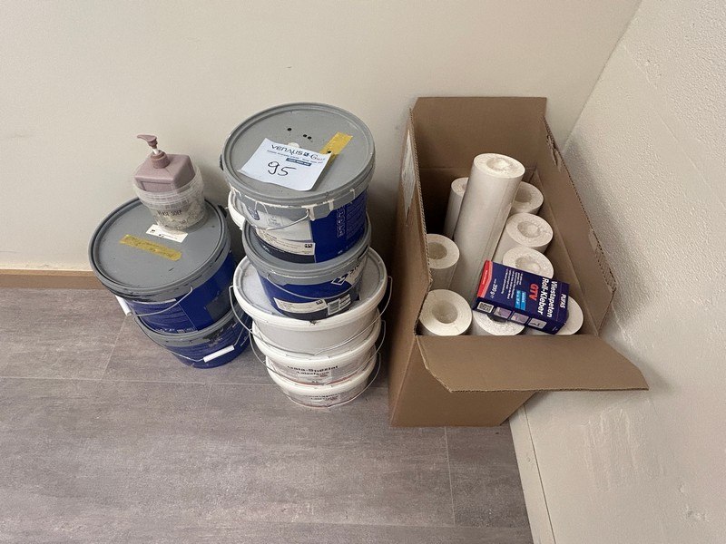 9 rollen vliesbehang (8.48m²/rol), 6 potten latexfrabe mat