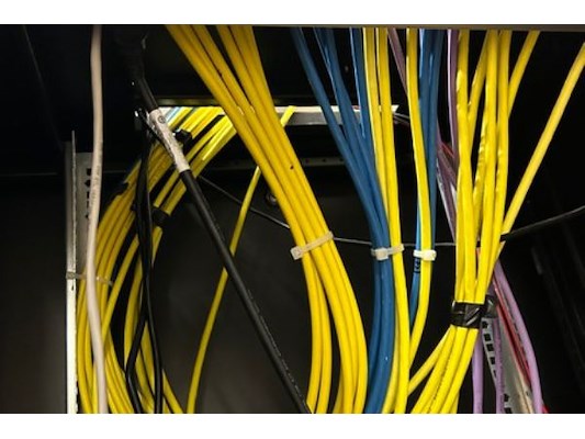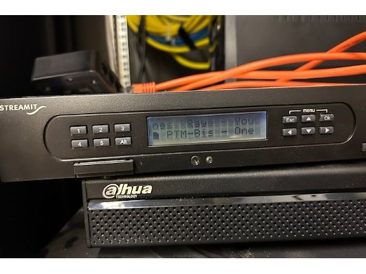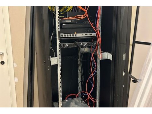 Serverkast met gigamedia patchpanel, unifi USW-24-POE, audac versterker = com24, stream it Lisa, infosec = x2LCD toudi 70...