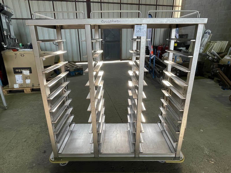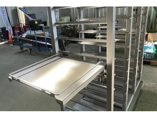 Inox, 140 x 65 x 150 cm hoog, met zijkanten uitgeklapt 215 x 65 x 150 cm hoog, plaats voor 30 dienbl...