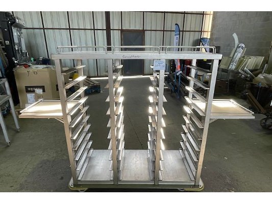 Inox, 140 x 65 x 150 cm hoog, met zijkanten uitgeklapt 215 x 65 x 150 cm hoog, plaats voor 30 dienbl...
