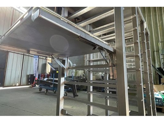 Inox, 140 x 65 x 150 cm hoog, met zijkanten uitgeklapt 215 x 65 x 150 cm hoog, plaats voor 30 dienbl...