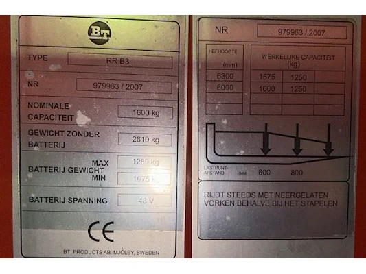 Bouwjaar 2007, hefvermogen 1600 kg, 2 mast, doorrijhoogte 295 cm, max masthoogte 630 cm, vorklengte 11...