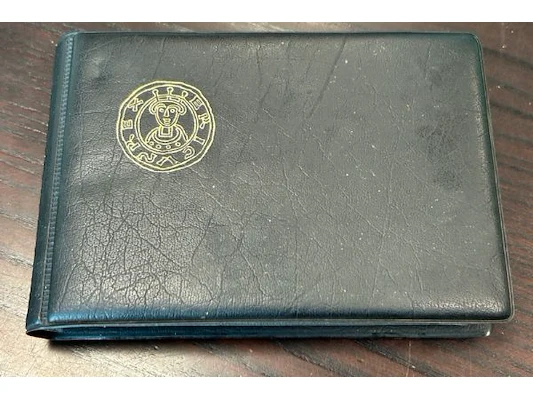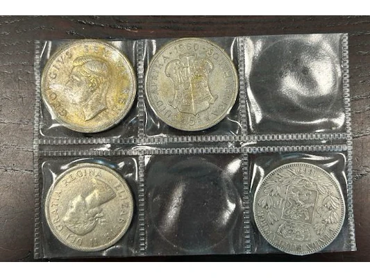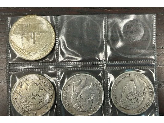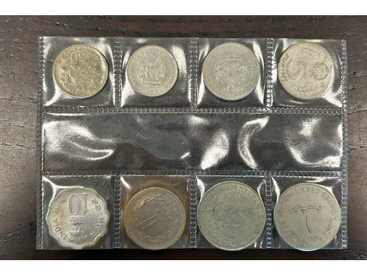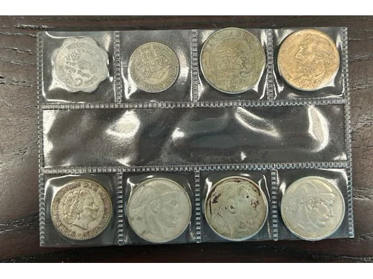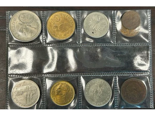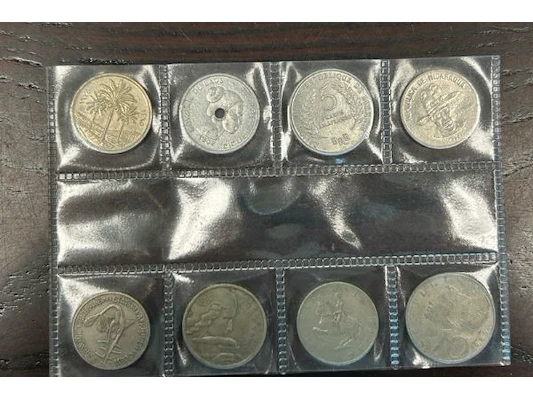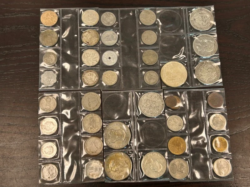 Ongeveer 40 munten in mapje waaronder Franse munten, 5 dollarmunt uit Bahamas, Canadese munt, Dirham munt, ...