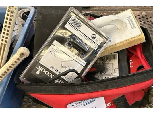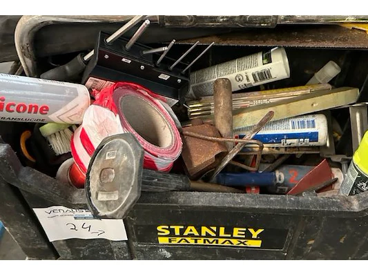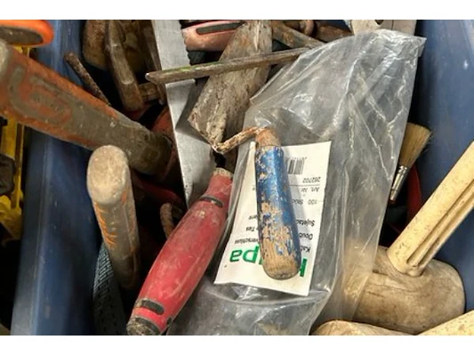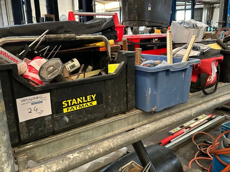Divers gereedschap waaronder hamer, truweel, beitel, schaar, statief, zaag, meter, ...