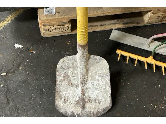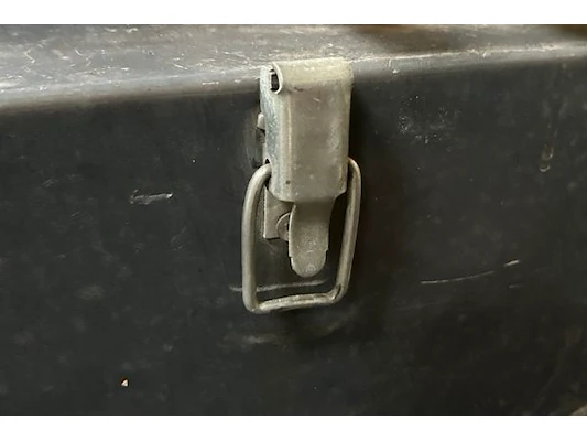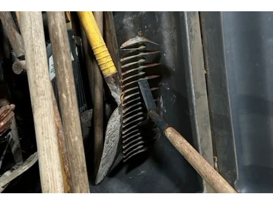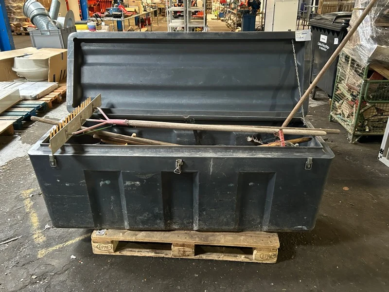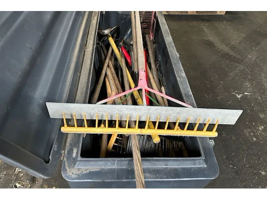 Opslagkist 177 x 62 x 65 cm hoog met inhoud als hark, schop, ...