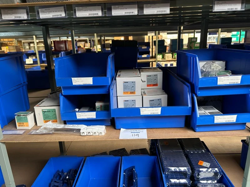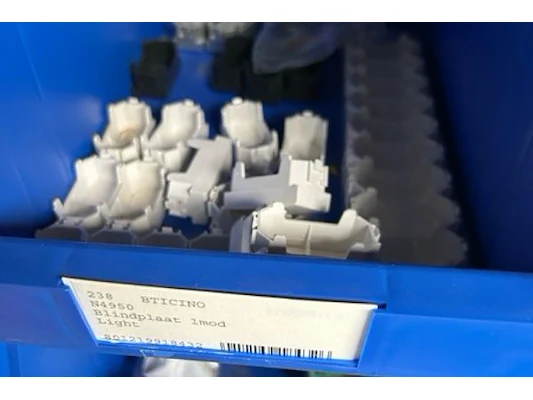 Ongeveer 20 doosjes electriciteitstoebehoren Btcino waaronder verlichting toetsen, blindplaat, toetsbedekking