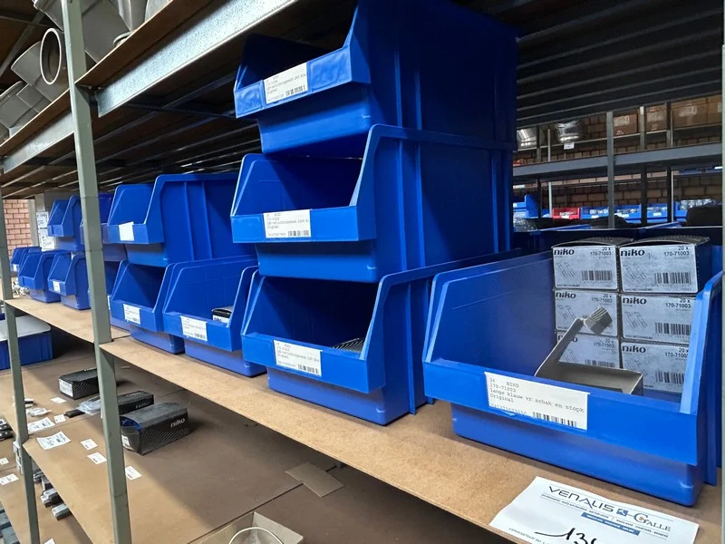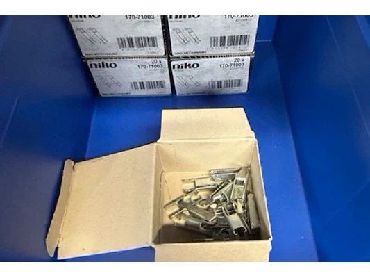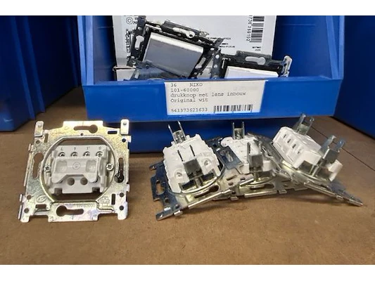 13 bakjes electriciteitstoebehoren Niko waaronder dubbele drukknop, sokkel drukknop, serieschakelaar