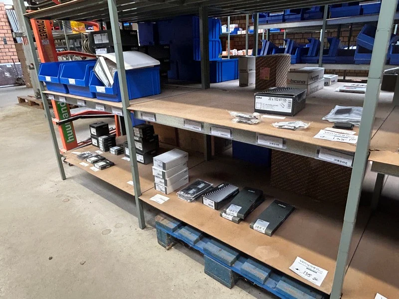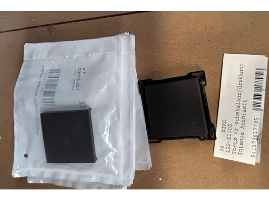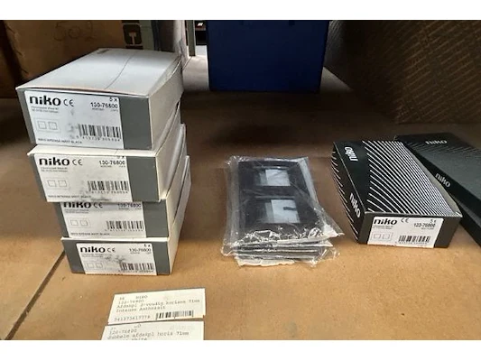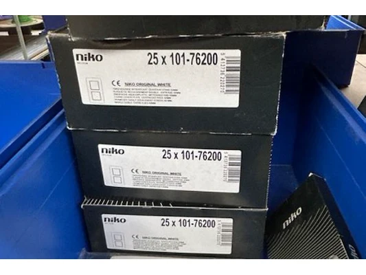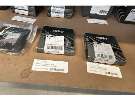 Ongeveer 30 doosjes electriciteitstoebehoren Niko waaronder schakelaar/drukknop, afdekplaat drievoudig verti 60 mm, afdek...