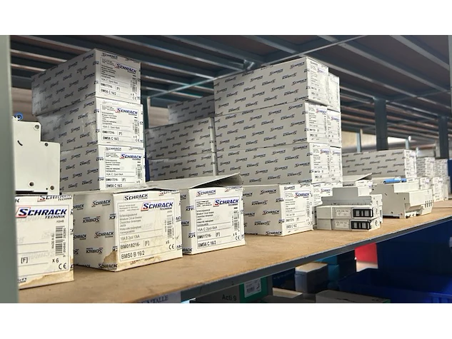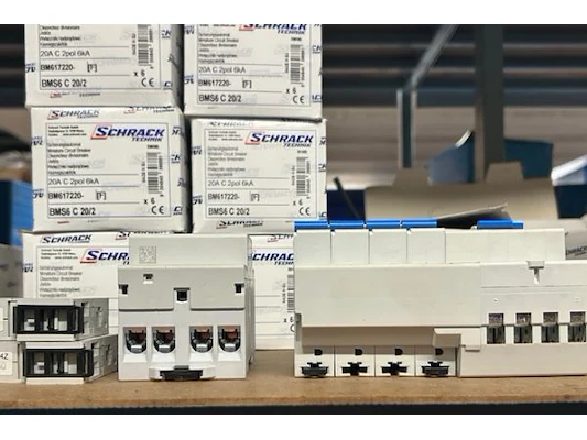 Ongeveer 48 dozen met stroomonderbrekers Schrack waaronder BMS6C16/2, BMS6C 20/2, BMS4C32/2, BCF6 40/4/03-A, ...