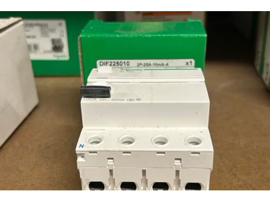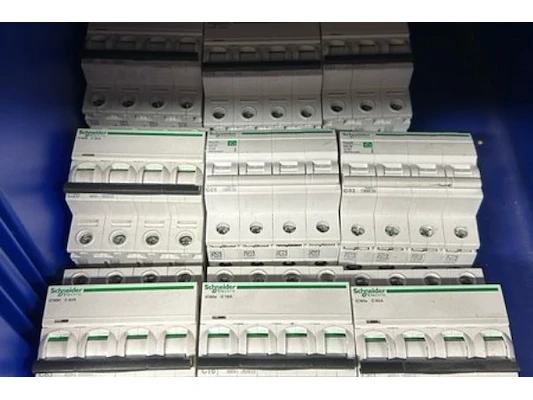 28 doosjes met electriciteitstoebehoren Schneider, waaronder automaten, differentieel schakelaar, dimmer, variateur