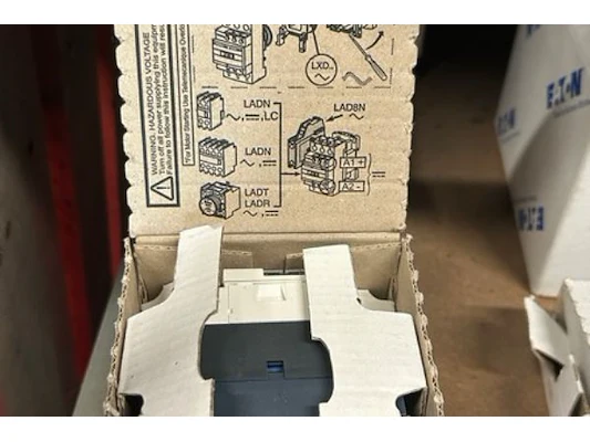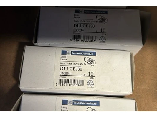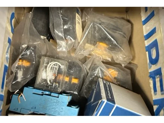 Ongeveer 20 doosjes met electriciteitstoebehoren waaronder contactoren, lampen, fraude bestendige doos