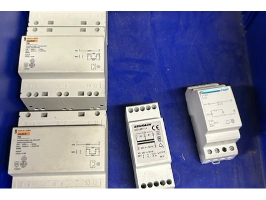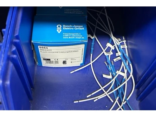 Ongeveer 22 doosjes met electriciteitstoebehoren, waaronder schakelblok, vermogensuitbreider, M6 trappenhuis automaat, aa...