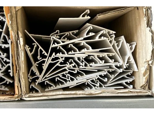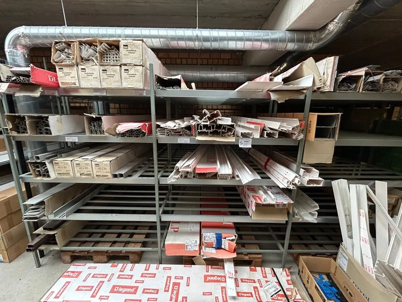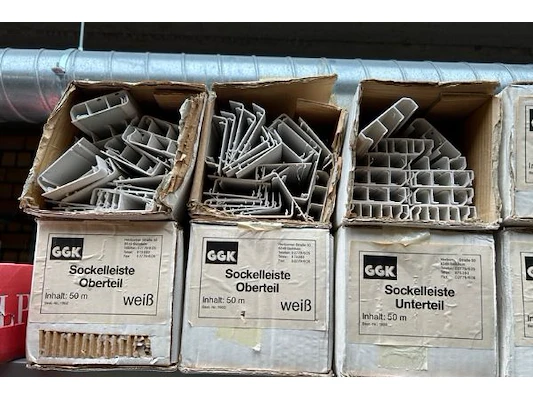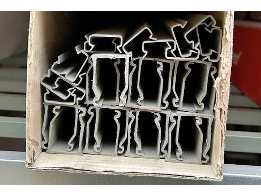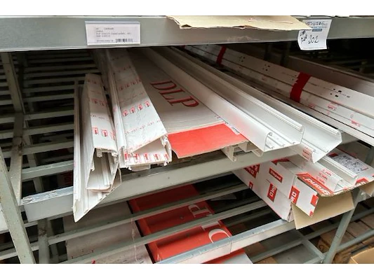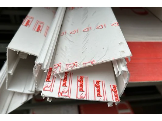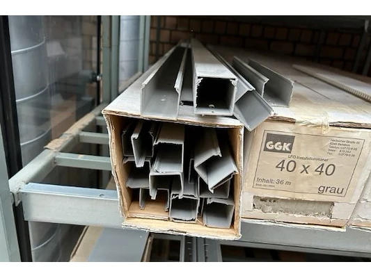 Ongeveer 38 kabelgoten, diverse maten waaronder 40 x 40, 75 x 20, 60 x 110, 80 x 50, ongeveer 20m/doos