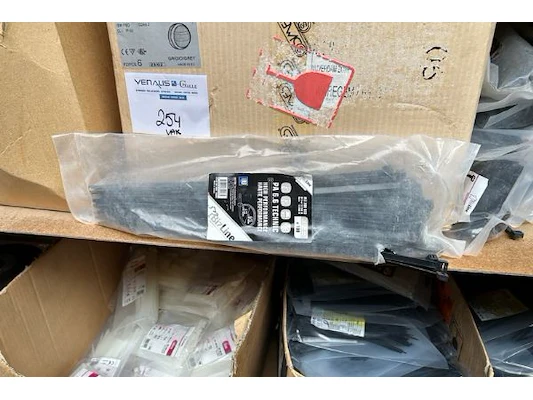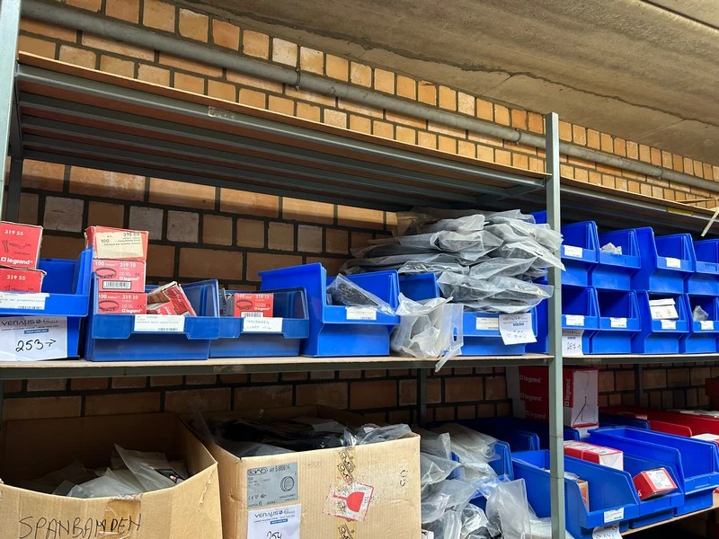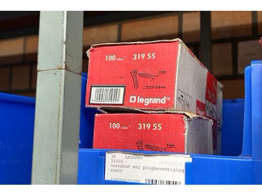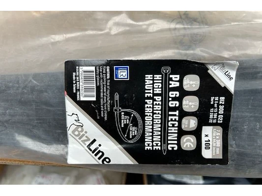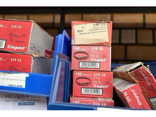 Ongeveer 5 bakken electriciteitstoebehoren waaronder spanbandjes, voetstuk met plugbevestiging