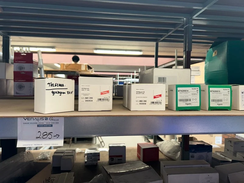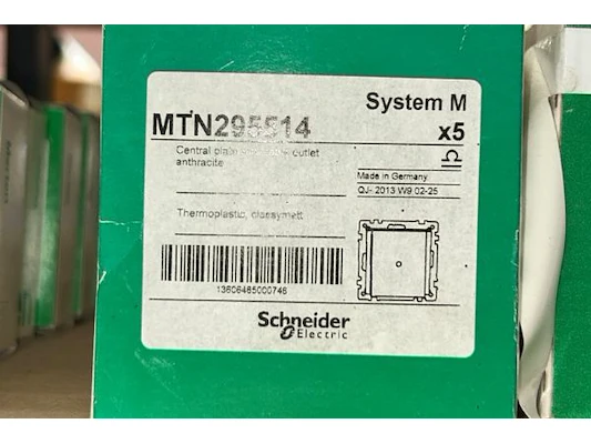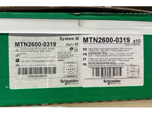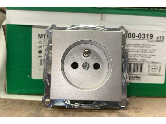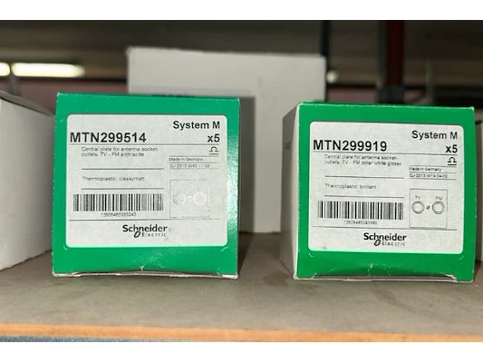 Ongeveer 58 doosjes electriciteitstoebehoren, Schneider waaronder stopcontact 2P+T, wandcontactdoos, centraalplaat, arres...