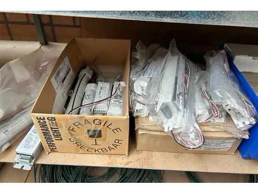 Waaronder diverse ballasten, noodverlichting, roosters, ijzerdraad