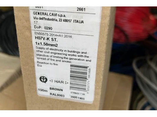 Ongeveer 1500m, waaronder H07V-K, 1x 1.5mm², 1x 6 mm²