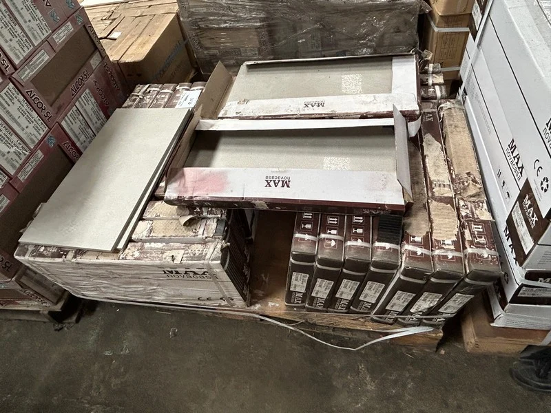 Tegel, 24 dozen, ongeveer 21m², grijze kleur, 30 x 60 cm, 5 stuks/doos, 1 doos = 0.9m² 21 M²