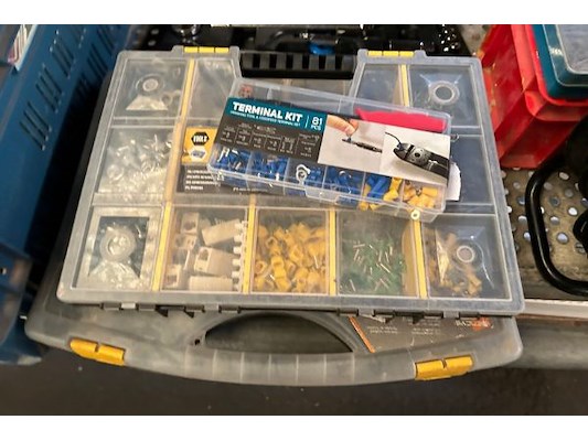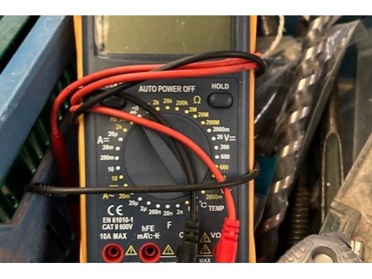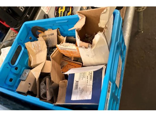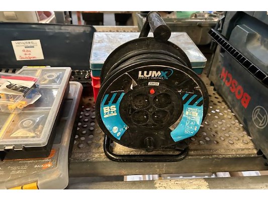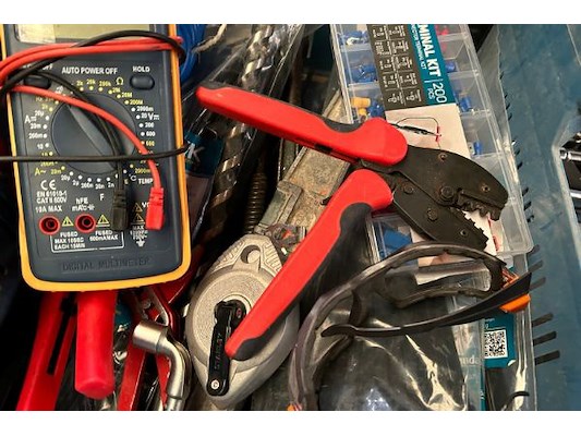 Lot varia waaronder houtvuller, soldeerbout, multimeter, handgereedschap, kabelhaspel, electriciteit, toebehoren