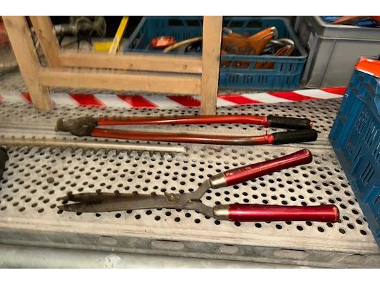 Zoals heggenschaar, recipro, schaar, bak met handgereedschap