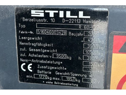 Heftruck Still, model R60-35, bouwjaar 2006, capaciteit 3500 kg, 3 mast, doorrijhoogte 296 cm, max masthoogte 7530 cm, vo...