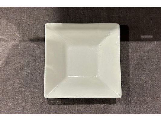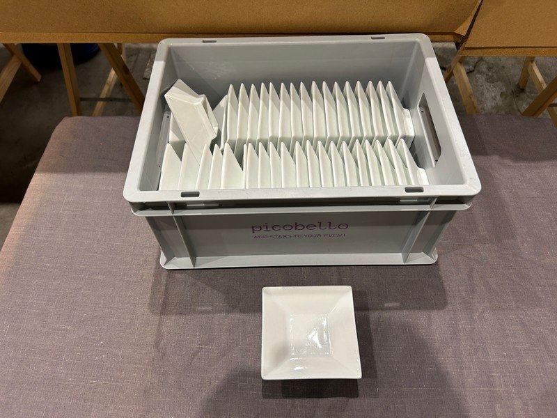 Ongeveer 120 witte schaaltjes, ongeveer 11.5 x 11.5 cm, + bak, zit ook in lot 533