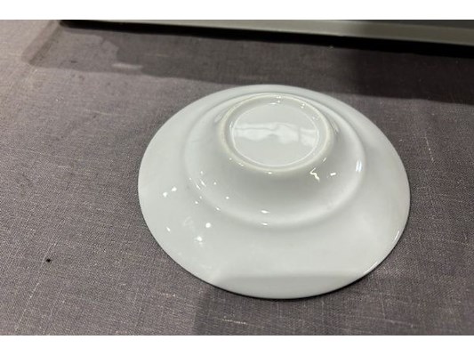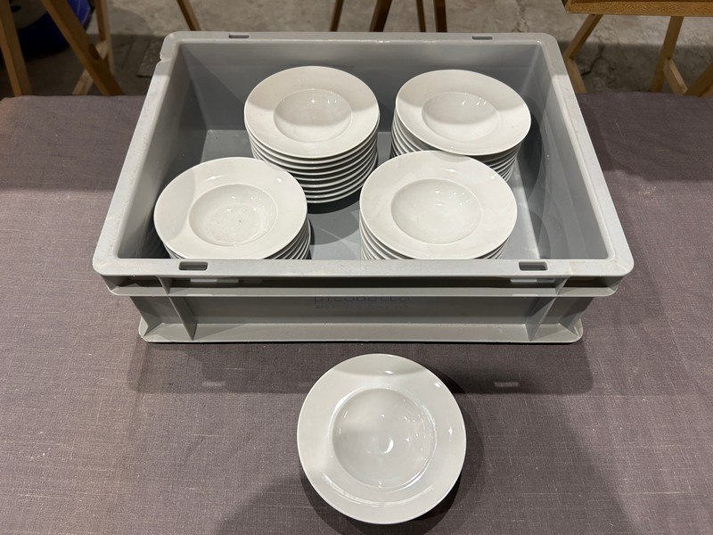 Ongeveer 100 witte bordjes, 13 cm diameter, + bak
