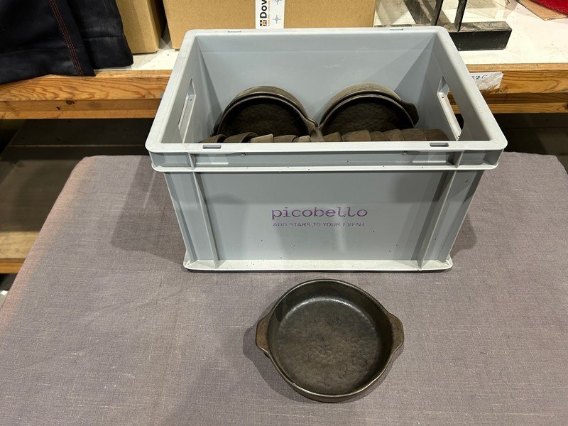 Ongeveer 17 bruine schalen, 16 cm diameter, 4 cm hoog, + bak
