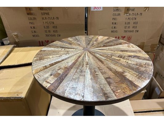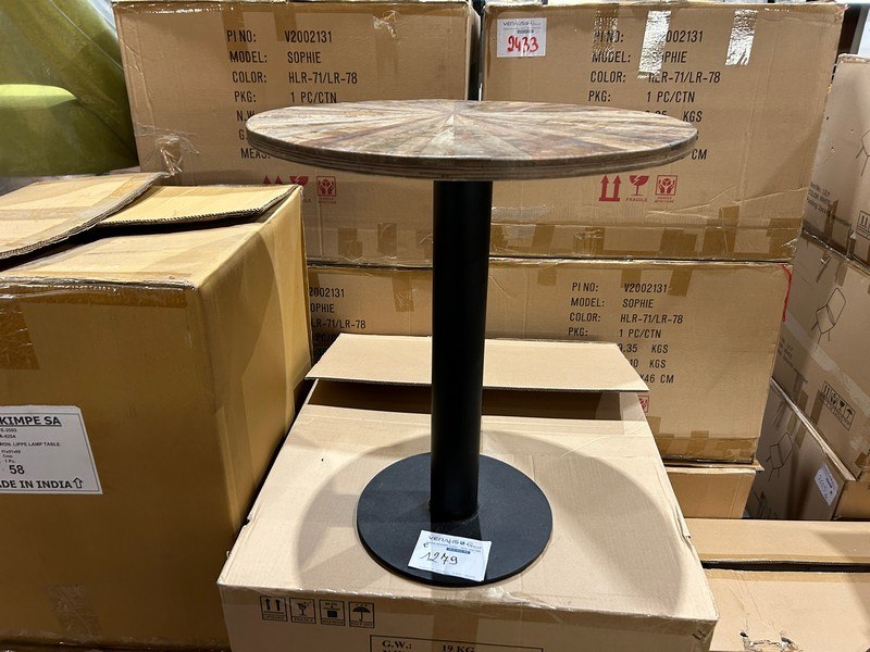 Houten blad, zwart metalen onderstel, 50 cm diameter, 60.5 cm hoog