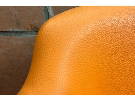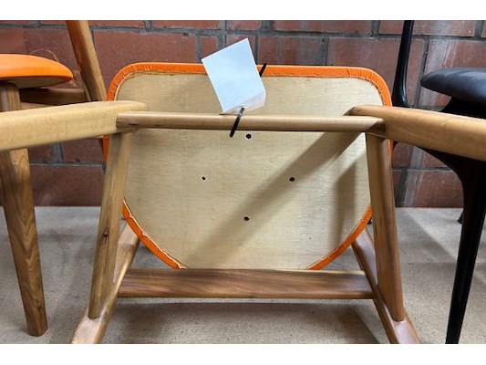 2stoelen, oranje zitting en leuning leer, houten onderstel