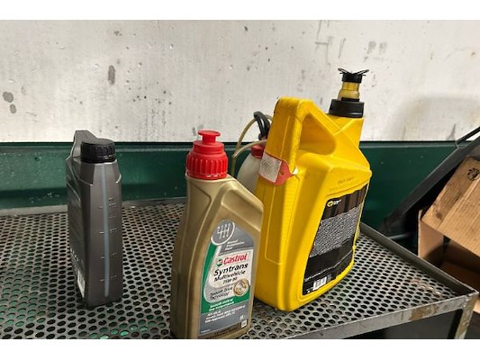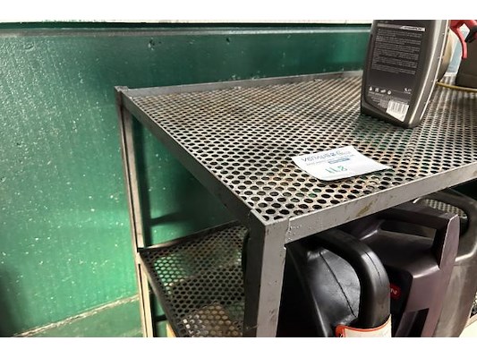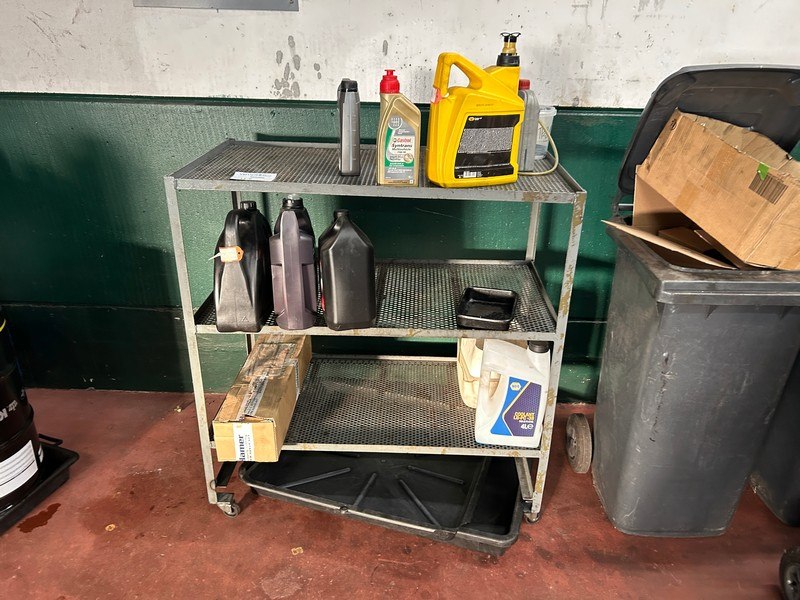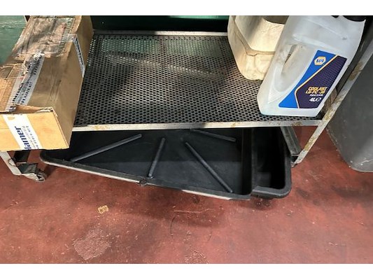 Rolkar met 3 niveaus 98 x 52 x 105 cm hoog, lekbak in kunststof 88 x 60 x 10 cm hoog, en inhoud zoals afgiftepistool met ...