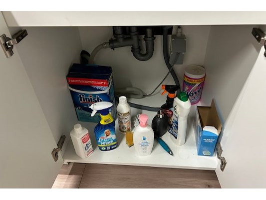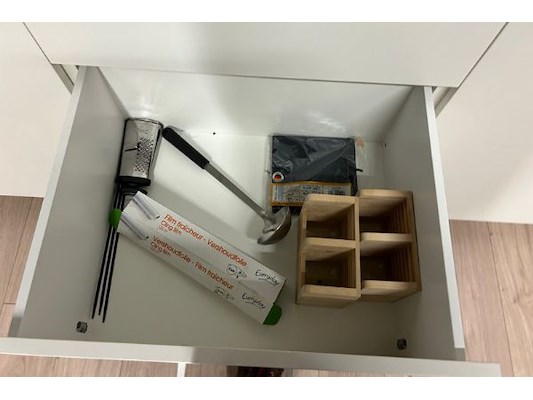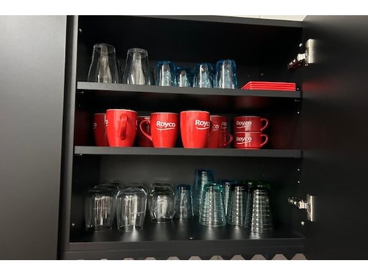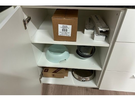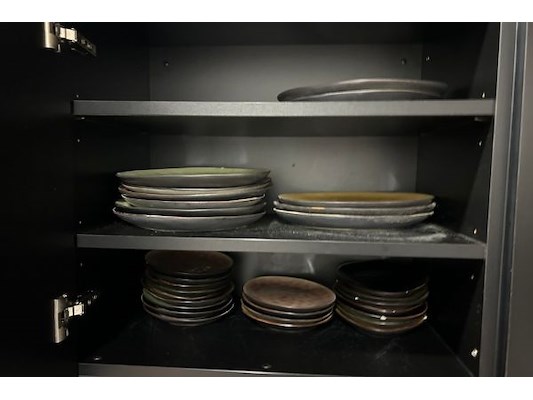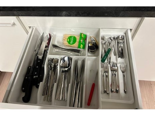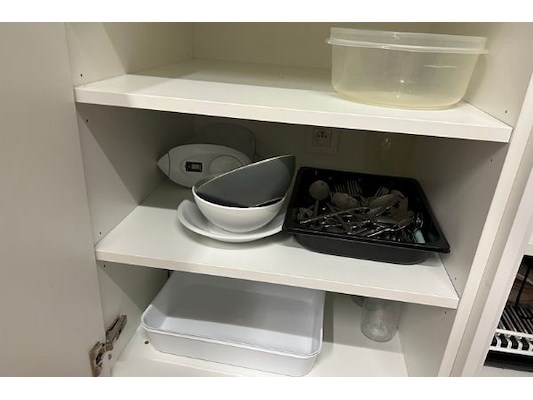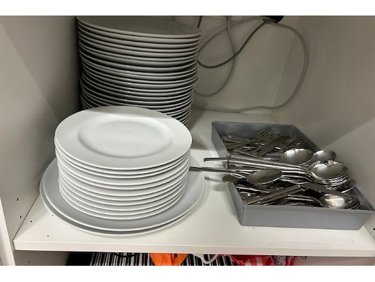 : waterkoker, kommen, borden, bestek, glazen, tassen