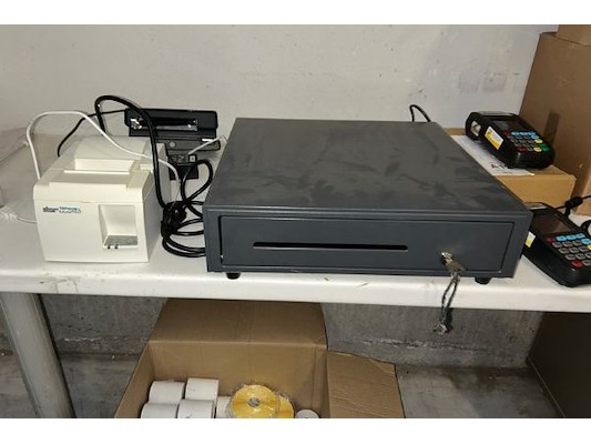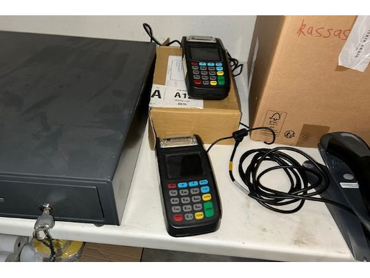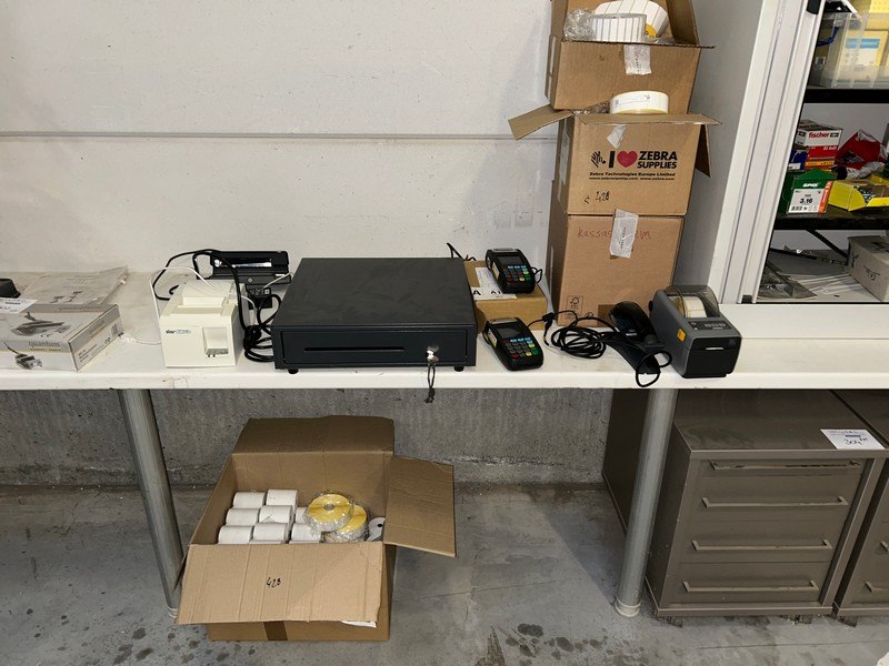 : Zebra ticketprinter, 2 Loyalter toestellen, kassalade, ticketprinter, safescan, rollen papier, etikette...