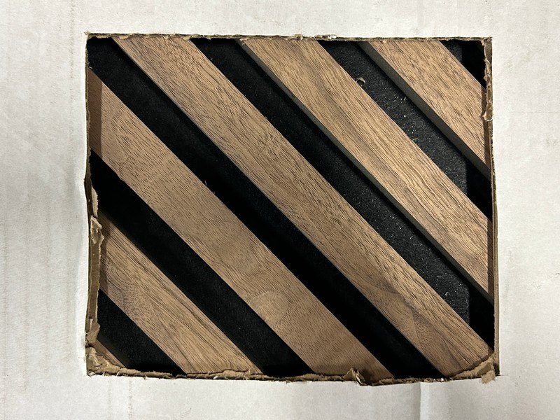 Ongeveer 44 akoestische wandpanelen, 2600 x 526 x 22 mm p/st, 2 st P/d, nieuw, walnoot