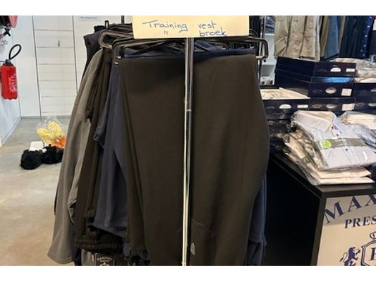 Ongeveer 50 training vesten en broeken, maat 2XL tot 9XL, merken als Maxfort, Adamao, ..., excl rek