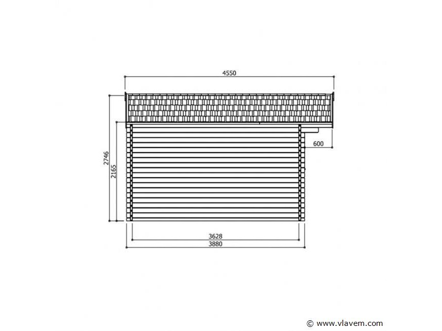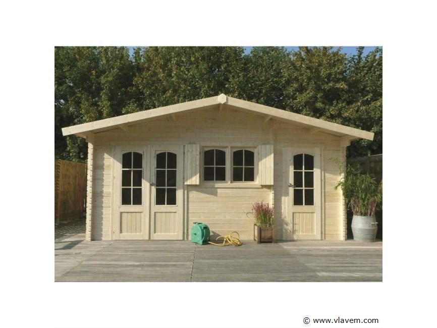 Tuinhuis rostock. Blokhutprofiel van 40mm dik scandinavisch vuren hout, overschilderbaar, een dubbele deur met glas erin, een enkele deur met glas op de voorkant, een dubbel draaikipraam met glas, dakhelling van 12°, rode shingles op het dak, sneeuwlast=75kg/m2, 1 paar luikjes. Luifel aan de voorkant van 60cm, verluchtingsrooster. LOW ENTRY=lage instap voorzien van een aluminium balk. Zelfbouwpakket af te halen in hamont hefruck aanwezig.