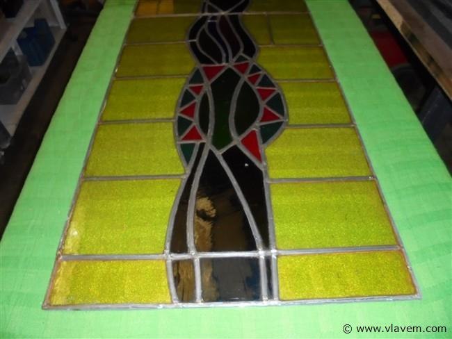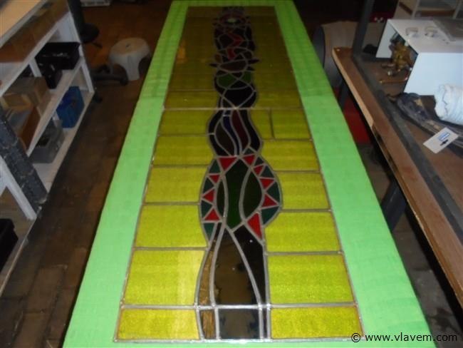 Raam in loodglas Van Kunstenaar Berrevoets perfect mooie staat word stevig ingepakt voor vervoer 2m16cm hoog en 58cm breed