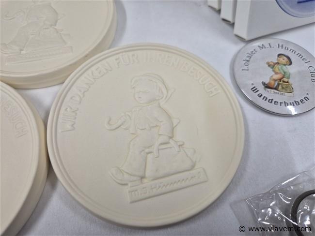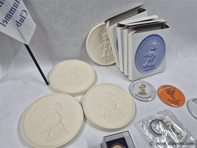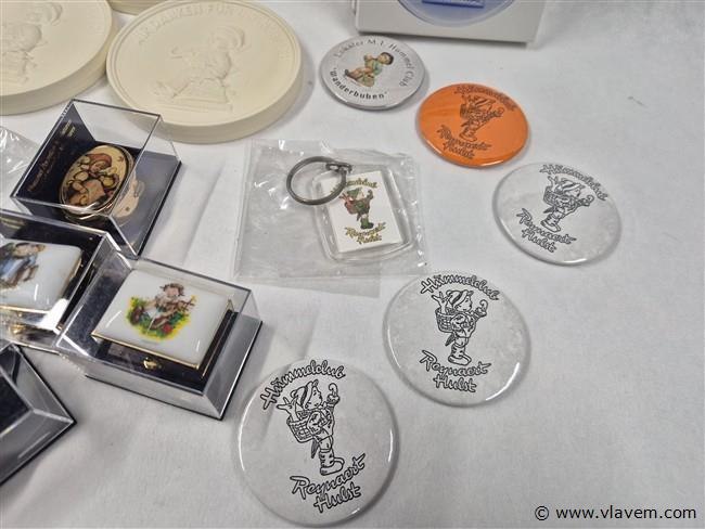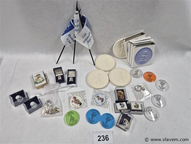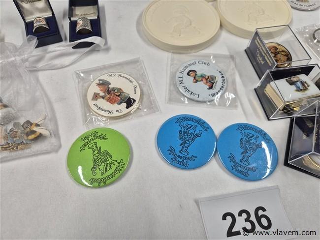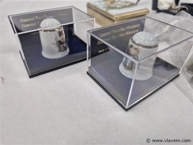 Vingerhoedjes, spelden, porseleinen plaquettes, pillendoosjes, vlagjes enz...