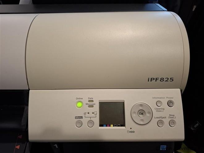 A0 Plotter + Scanner, fabr. CANON, type IPF825. De printer kan verschillende media aan tot een breedte van 914mm. Er is mogelijkheid tot 2 rollen media (onder elkaar). Er is mogelijkheid tot opvang v/h geprinte medium. De scanner kan tot 914mm breedte aan. (PC en software niet inbegrepen).