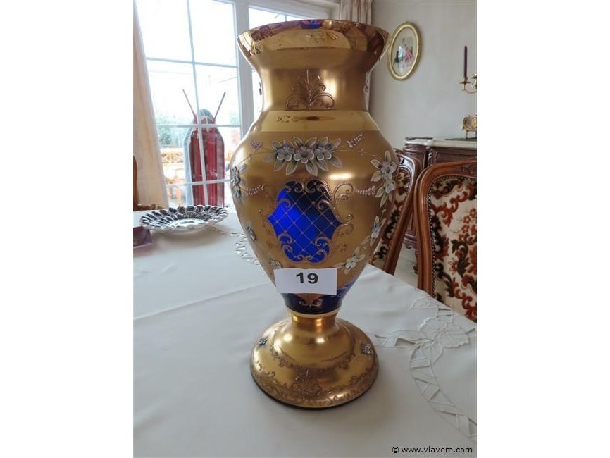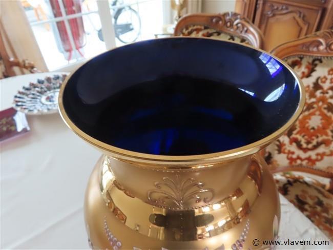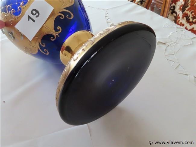 Vergulde blauwe glazen vaas met porselein versiering