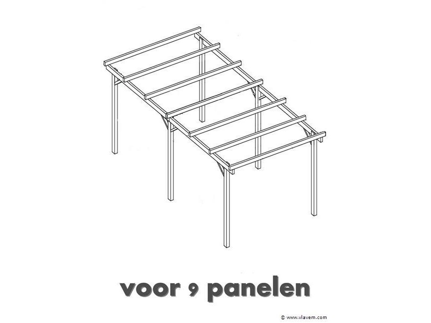 1x Carport, afmetingen circa 308x516cm., hoogte 290cm., afm. geschikt voor 9 panelen, inclusief bouwtekening bouten schroeven en bevestiging, exclusief voet (zie andere kavels) en dakplaten (worden zonne collectors niet inbegrepen) afschot zelf te bepalen dmv staanders van 9x9x290 inkorten ,dakbalken 4,5x14,5 alles geïmpregneerd/gegalvaniseerd, let op fotos zijn voorbeeldfotos