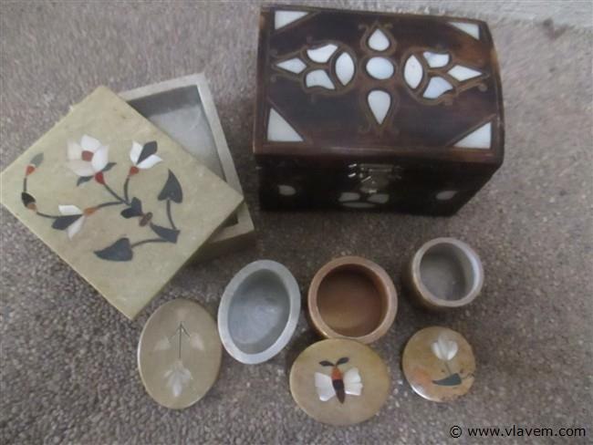4 stenen deksel potjes en 1 houten