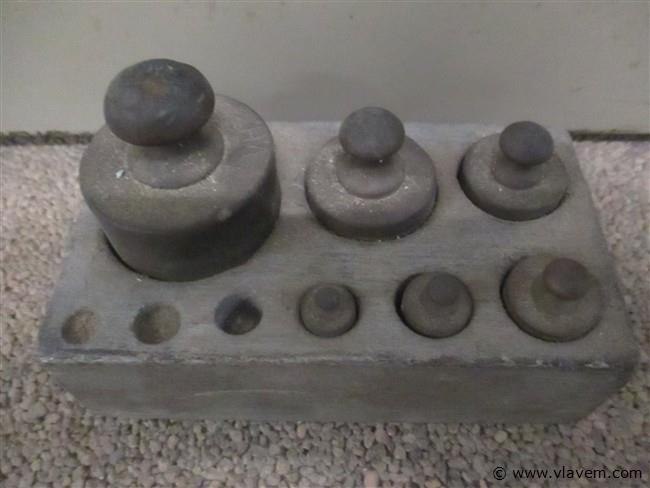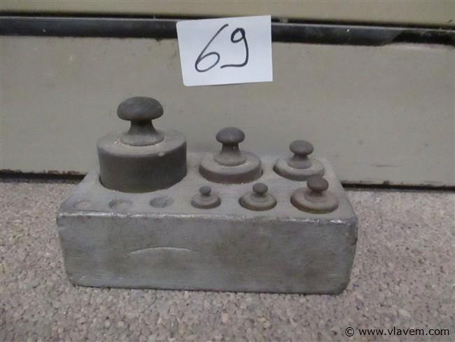 Koperen gewichten in houten houder,3 kleinste ontbreken