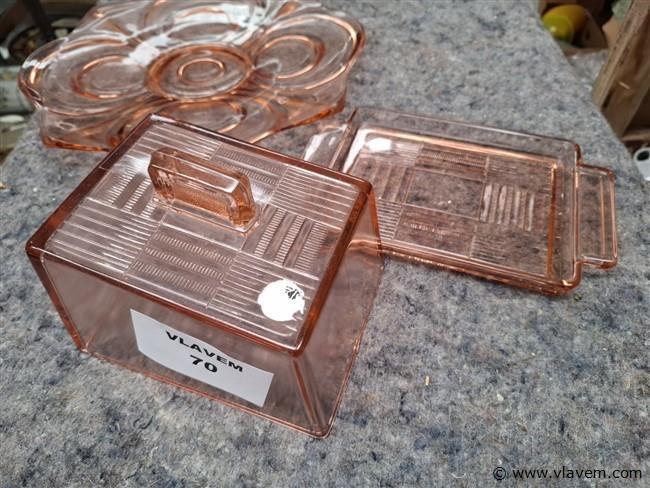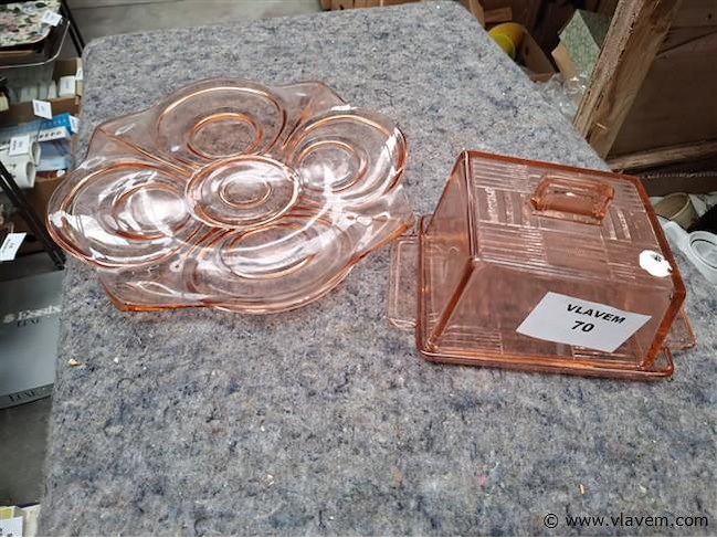 Vintage glazen botervloot en schaal in gekleurd glas