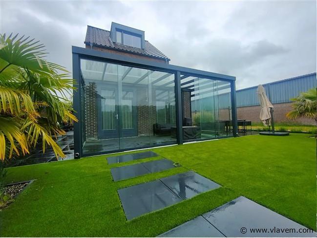 Schuifdeursysteem voor aanbouw, overkapping, veranda of tuinkamer, Compleet set met 6 stuks glasdeuren van 1030 mm en boven- en onderrail, verstelbare glasprofielen, glasopvang-tochtprofielen en twee grepen 2700mm hoog ( min 2670 en max 2710 mm ) breedte 6030 mm, breedte inkortbaar, kleur Mat zwart RAL 9005, Dit product wordt gratis thuisgeleverd ( 1 persoon moet helpen lossen)