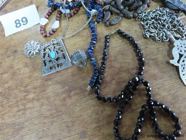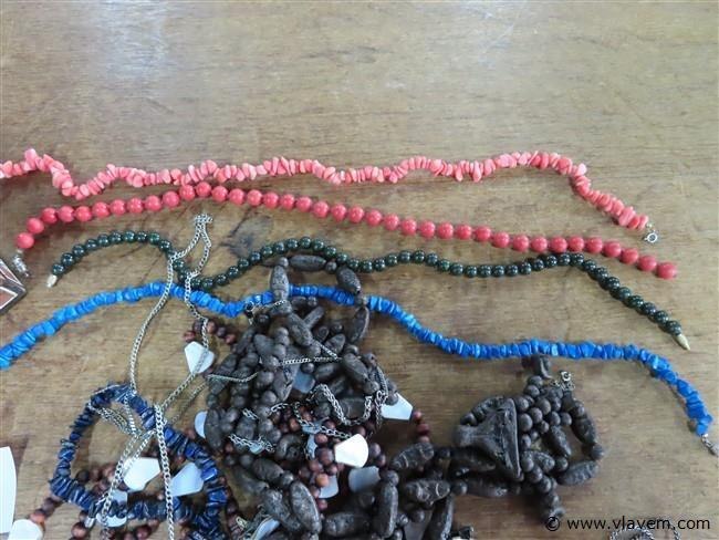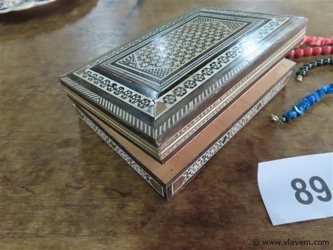 Varia, houten doosje, juwelen, kettingen, horloge enz...