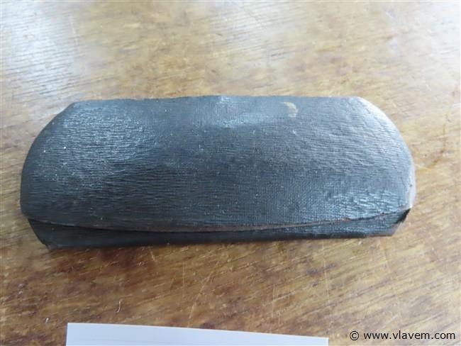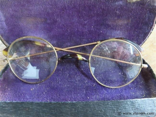Oude bril in metalen houder