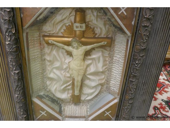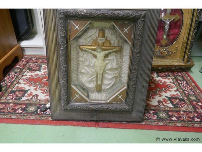 Antieke kader met kruisbeeld , onderaan muziekdoos (voor nazicht) afm plm 45 x 57 cm
